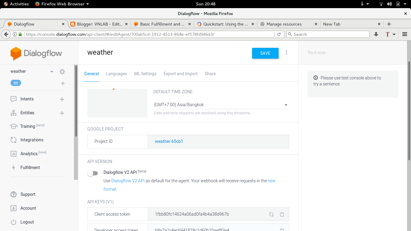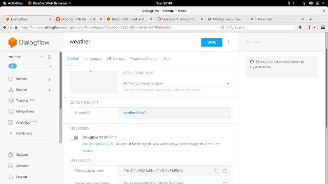 Khi bạn tạo mới 1 agent thì DialogFlow mặc định sẽ tạo 1 Google Project cho bạn. Bạn vào setting sẽ thấy nó ở trong Project IDClick vào sẽ nhảy đến giao diện Console của Google Project.