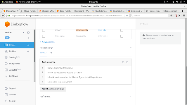 Cột bên phải trong console của DialogFlow là mục “try it now”bạn thử nhập câu hỏi như “Weather forecast in hanoi tomorrow” thì sẽ nhận đuợc câu trả lời lấy từ weather API thông qua webhook