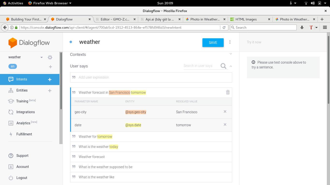 Sau khi nhập vào bạn sẽ thấy từ “today” và "tomorrow" được bôi màu vàng, còn từ “San Francisco” đuợc bôi màu đỏ. Đây là những system entity được định nghiã từ trước. Những entity này cho phép DialogFlow hiểu những thời gian và địa điểm khác mà nguời dùng nhập vào