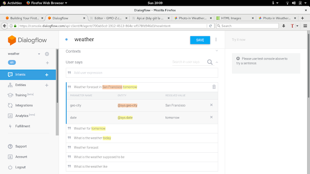 Bây giờ chúng ta tạo 1 intent mới. Bạn click vào mục Intent ở menu bên trái rồi chọn Create Intent. Bạn đặt tên cho intent mới là “weather” rồi ấn nút Save.Phần “User says”