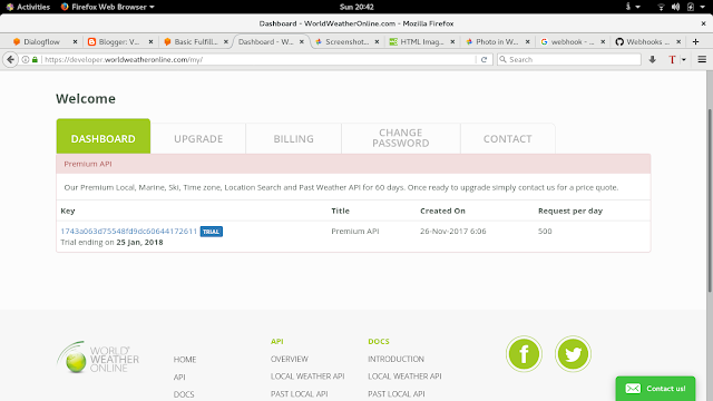 Vào https://developer.worldweatheronline.com/api/ để đăng ký tài khoản mới rồi lấy API keyKết nối DialogFlow và Cloud Function API