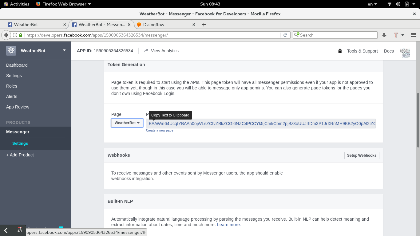 Sau khi add product xông thì bạn vào product “messenger” , phần token generation chọn fanpage “Weatherbot”